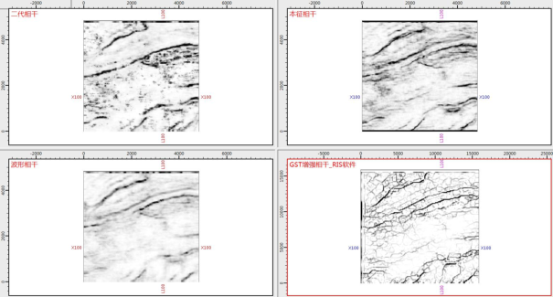 下图是二代相干,波形相干,本征值相干以及GST增强相干的时间切片对比图,从图中可以看出,二代相干(下图左上角)仅仅能刻画大断裂,并且还不是很清晰,波形相干(下图左下角)能刻画大小断层,但不连续且模糊,本征值相干(下图右上角)是精度相对较高的第三代相干算法,能刻画连续的大小断层,但对于微小断层和裂缝依然无能为力,GST增强相干(下图右下角)则克服这些缺点,它从复地震道作为输入,克服信噪比低的问题,同时采用梯度方向搜索,克服断层跳跃以及平坦区域问题,它不仅可以识别大断层,还可以识别微小断层,以及因为岩性变化,孔隙地质因素引起的微裂缝问题。从图中可以看出大小断层刻画连续清晰,裂缝也非常发育。