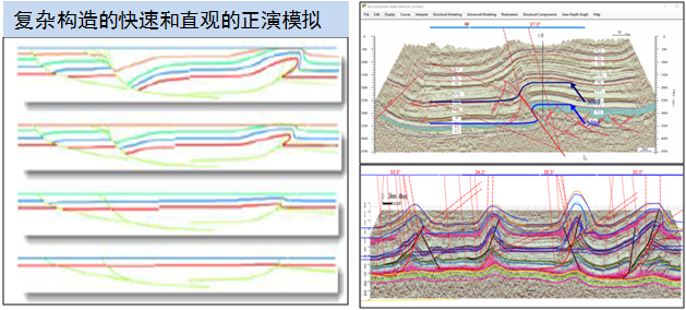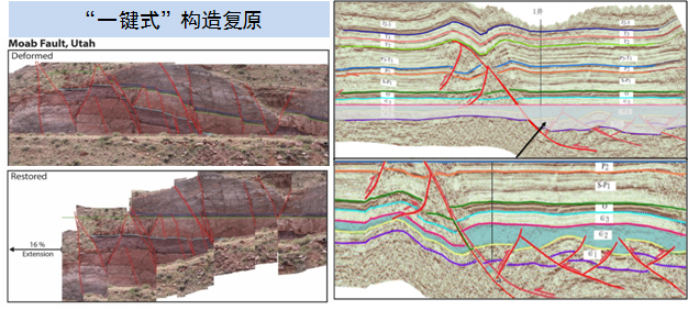 一键式构造恢复技术获得了美国专利。从版本3.0开始在构造恢复算法上采用弯曲滑动,垂直剪切和倾斜剪切多种恢复方法,恢复过程只需一键即可得到结果,软件也可以在恢复的剖面上测试恢复的精确性,大大提高了工作效率和结果的精度。