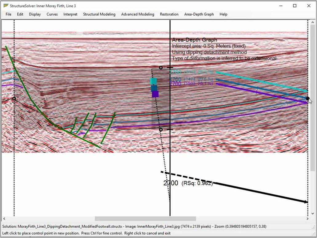 包括构建面积—深度图,调整相关控制线和增加层位,显示面积深度分析结果和滑脱层深度、位移以及平行层的应变等。